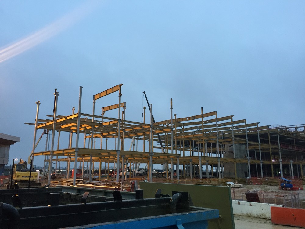 La structure comporte 2 niveaux de planchers mixtes repris par des poteaux acier remplis de béton pour la stabilité au feu. Portée des planchers : 9 m, portée en toiture : 18 m.