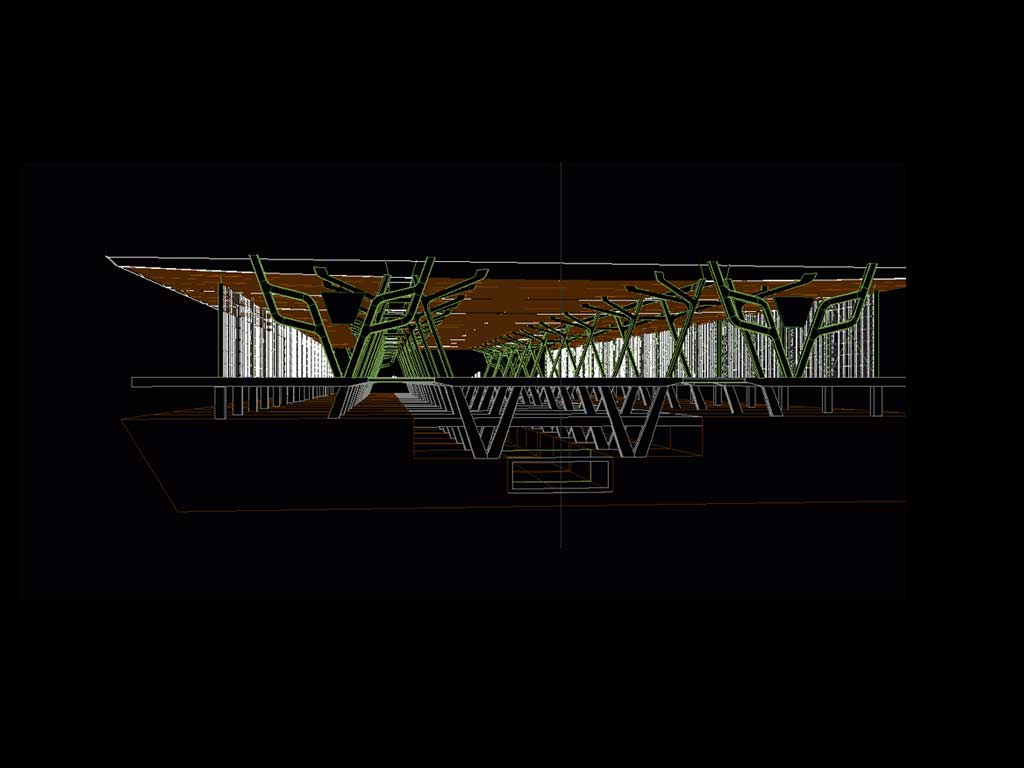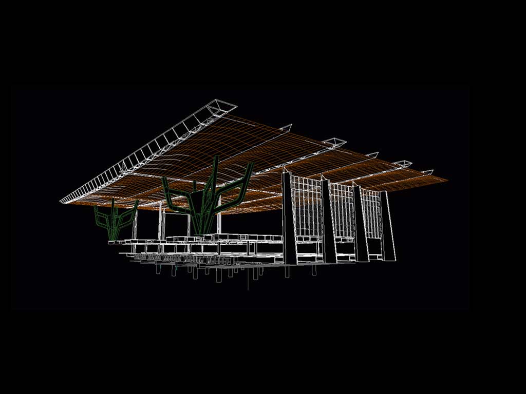 Conception et dessin de la toiture en coopération avec l'Institut 2. Calcul de la structure, les masques en facade sont porteurs et assurent le contreventement de la toiture. Mise au point d'un principe de ponts-rails sur appuis glissants pour éviter la transmission des vibrations et des efforts de freinage des trains au bâtiment. Collaboration avec IGOA.