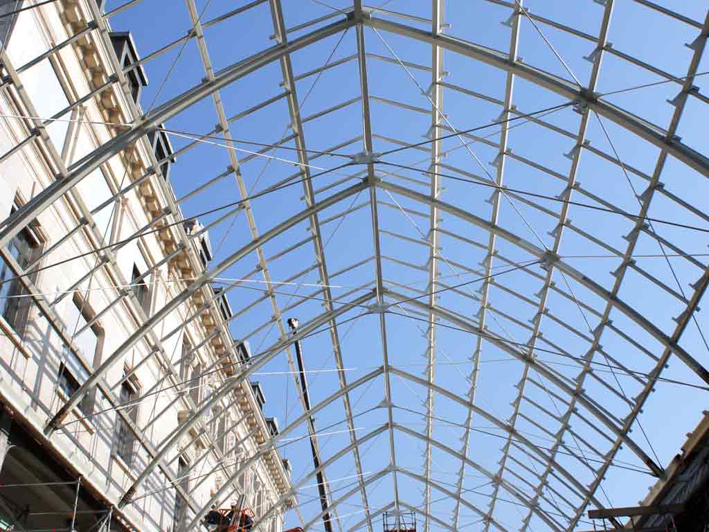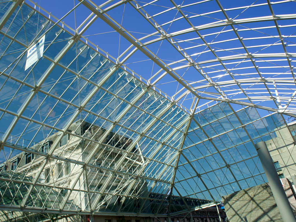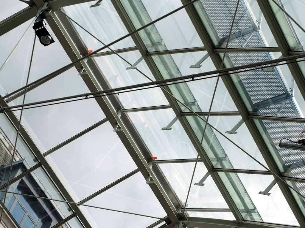 Le contexte historique est l'occasion d'une traduction contemporaine des méthodes de l'architecture industrielle du XIXème siècle : trame liée aux capacités du verre, association de tôles et de profilés élémentaires pour composer de pièces élaborées, imbrication de l'acier et de la maçonnerie, chéneaux structurels, pièces forgées pour les tirants.