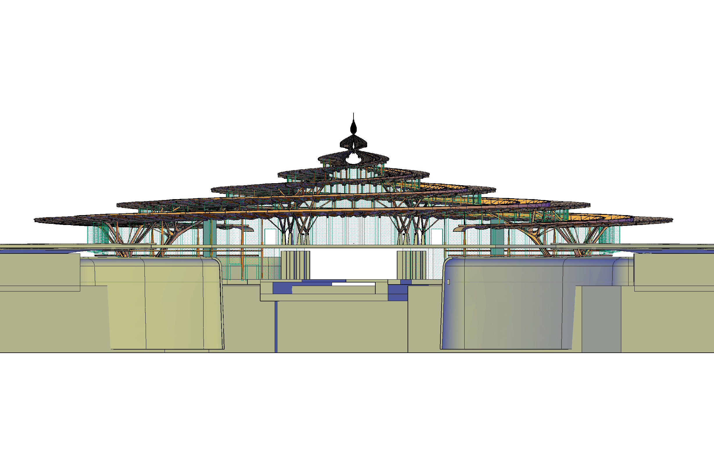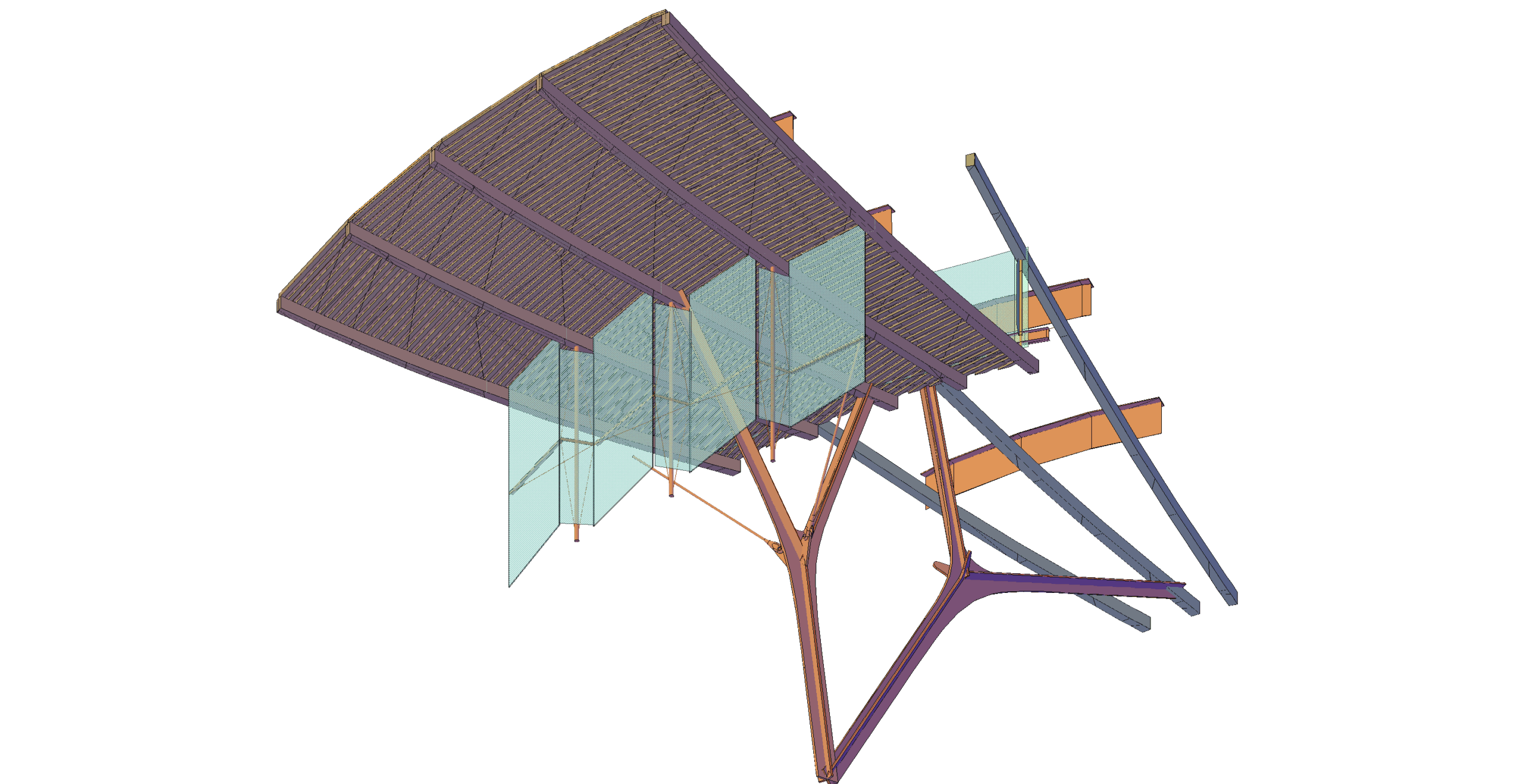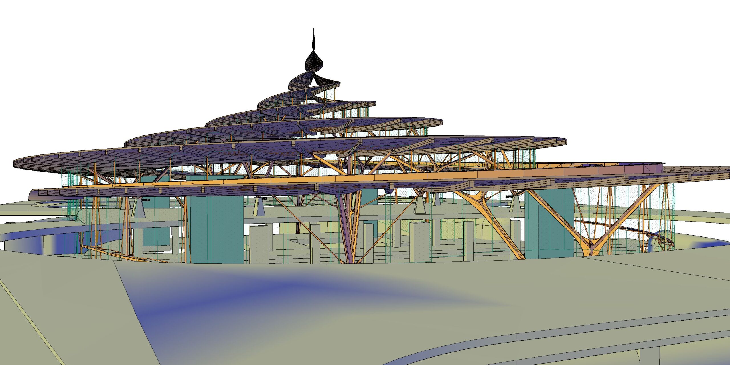 La toiture est constituée de 2 hélices entrelacées se rejoignant au sommet. Les hélices sont en structure mixte bois / acier, et s'appuient sur 12 poteaux arborescents. L'eau est évacuée en pied des hélices par 2 chutes d'eau.