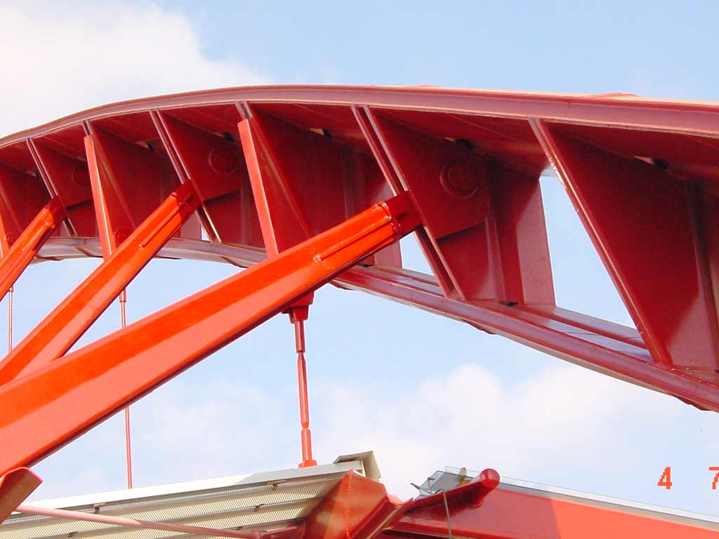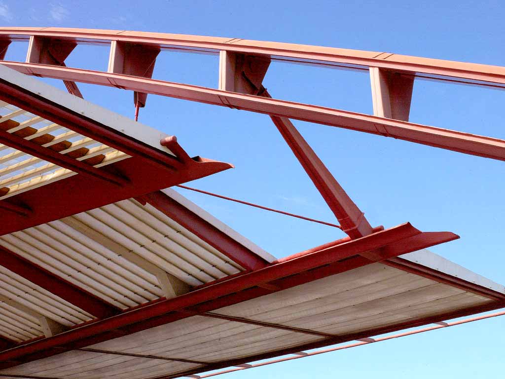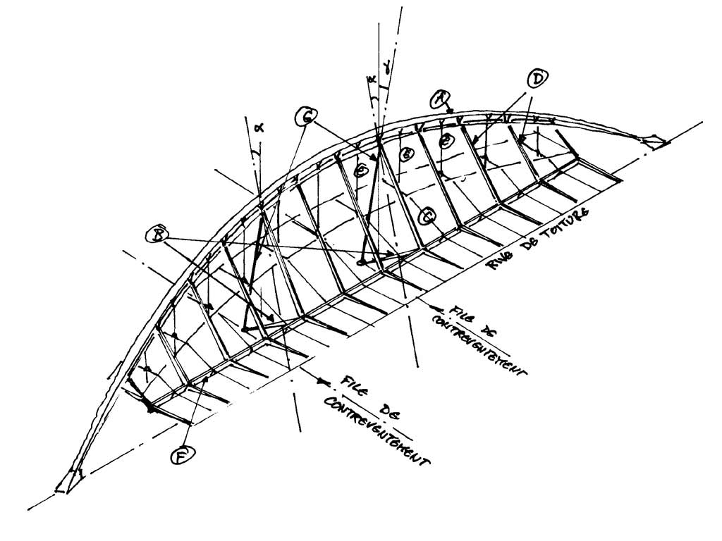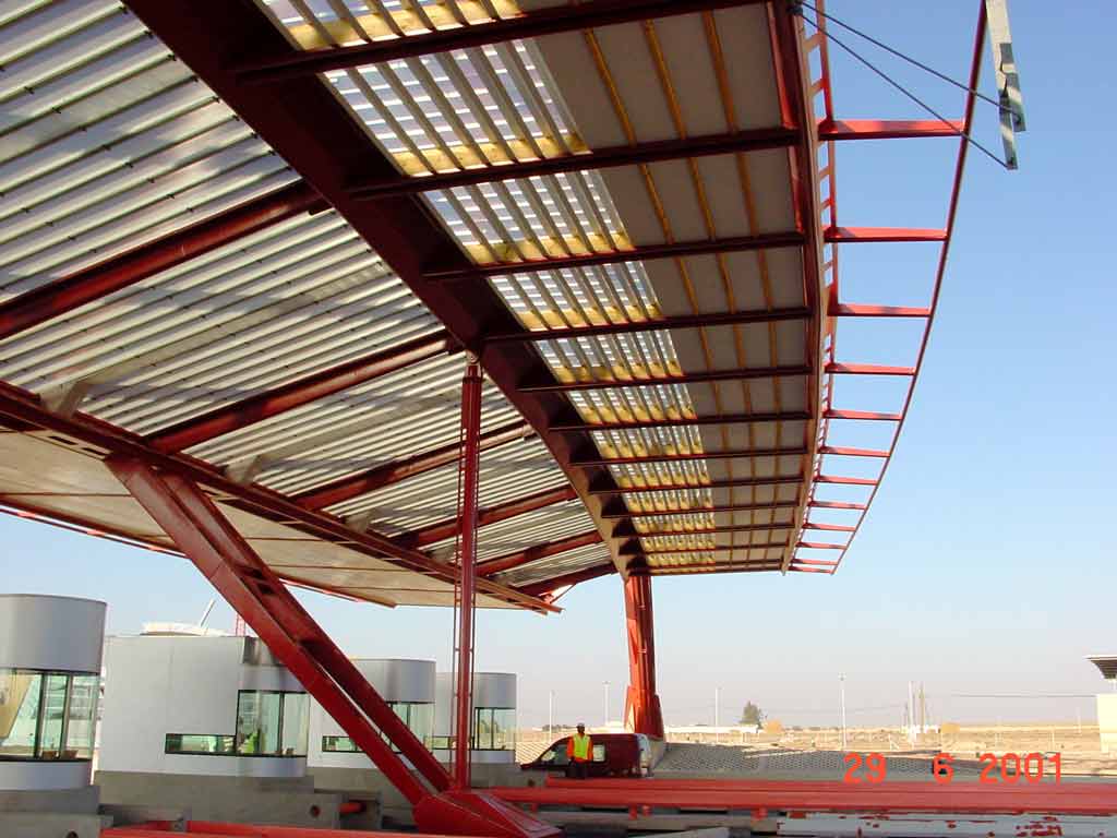 L'auvent de 65 x 16 m est suspendu à un arc de 85 m de portée, incliné de 20° par rapport à la verticale. La structure est en tôle pliée de 6 et 8 mm. La couverture de l'auvent est en polycarbonate alvéolaire, en verre profilé en U (Reglit), et en bois.
