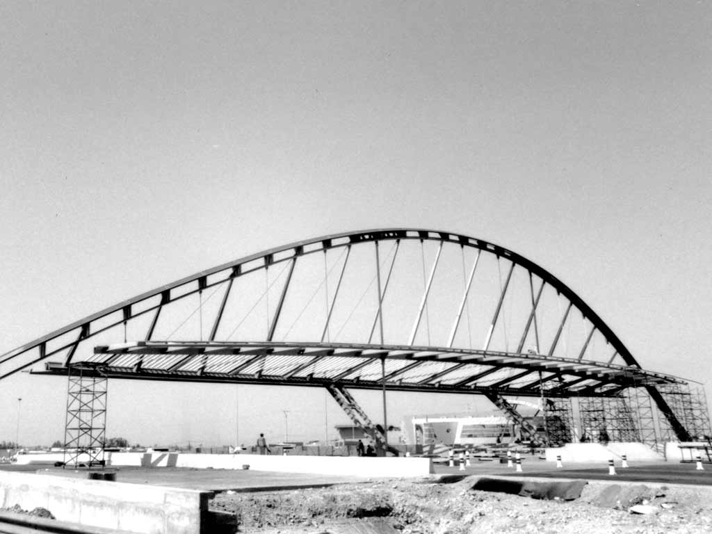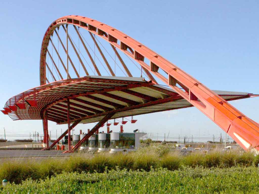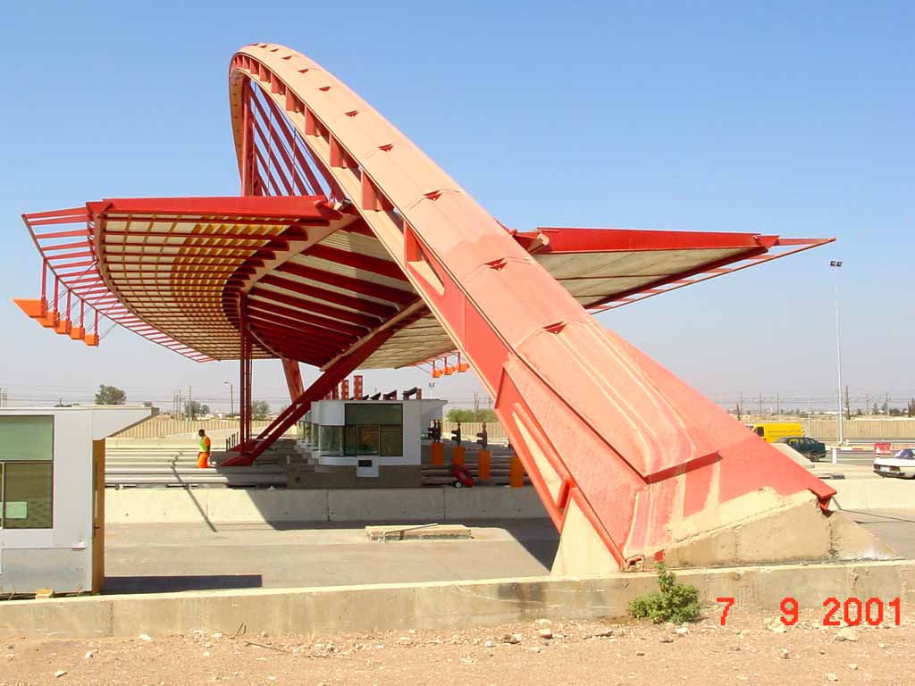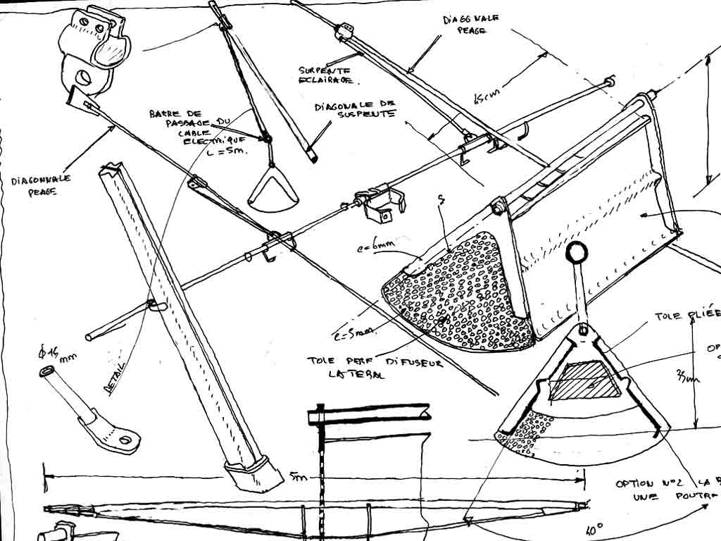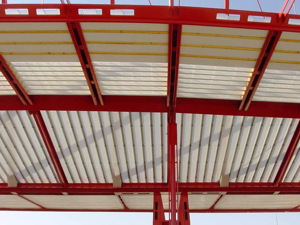 L'auvent de 65 x 16 m est suspendu à un arc de 85 m de portée, incliné de 20° par rapport à la verticale. La structure est en tôle pliée de 6 et 8 mm. La couverture de l'auvent est en polycarbonate alvéolaire, en verre profilé en U (Reglit), et en bois.