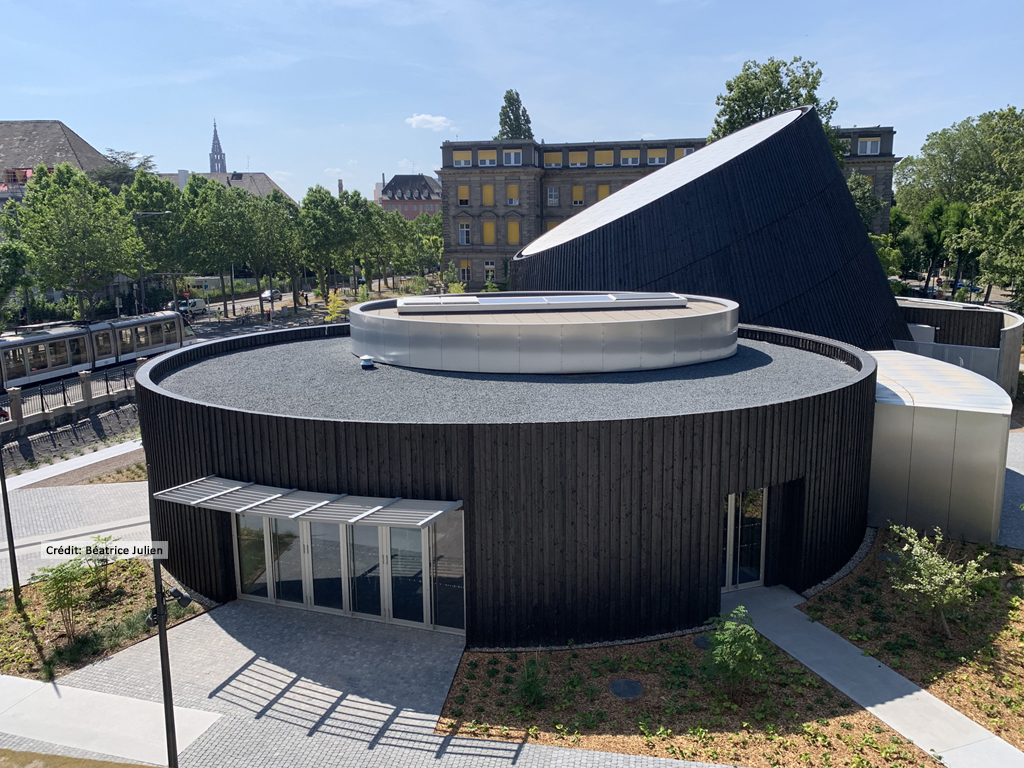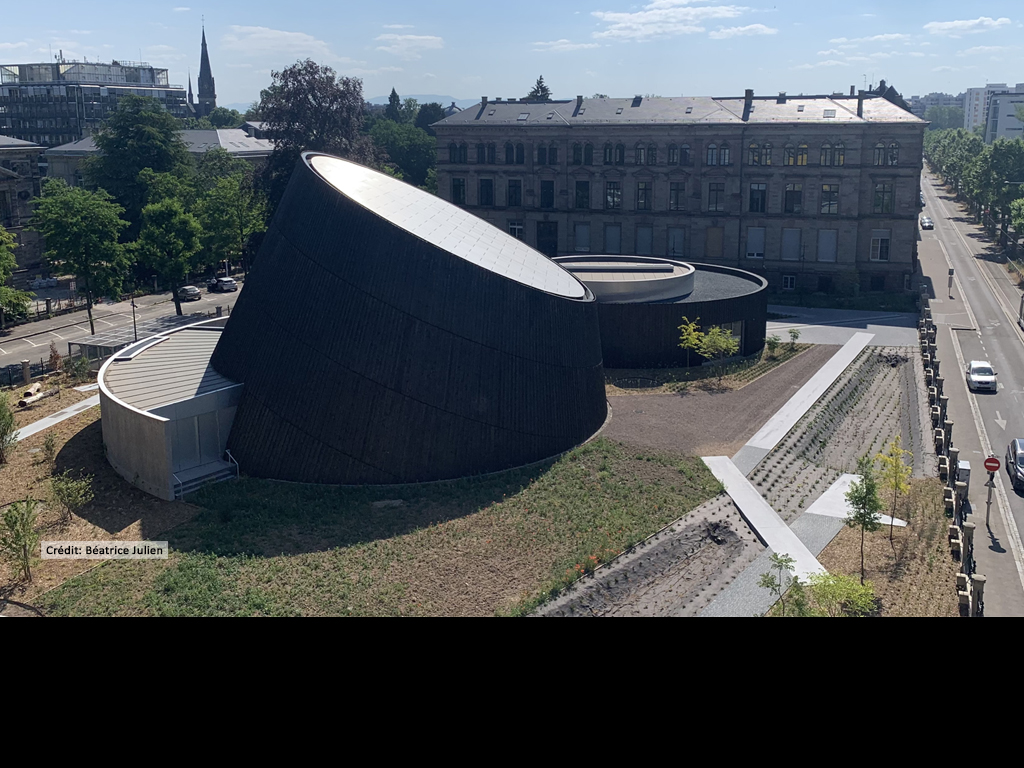 Le bâtiment situé dans le jardin des sciences de l’université de Strasbourg est composé de deux volumes : conique et cylindrique.