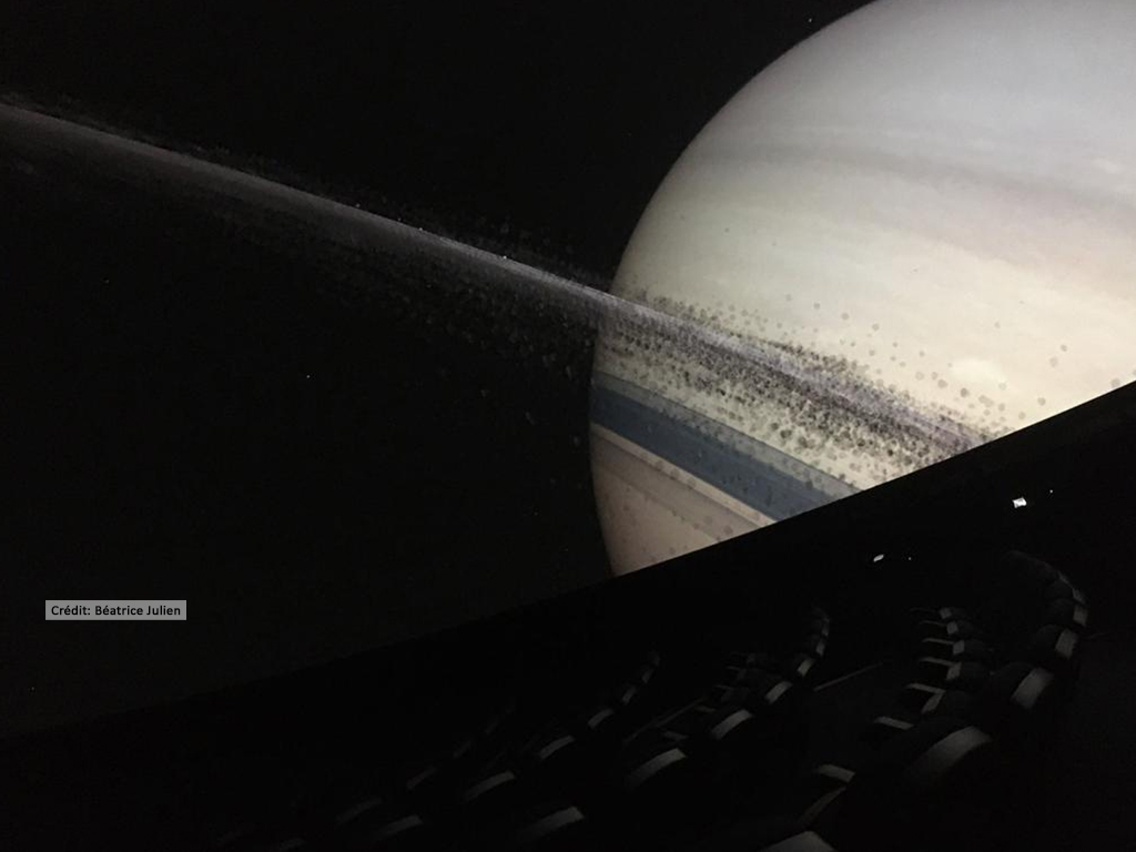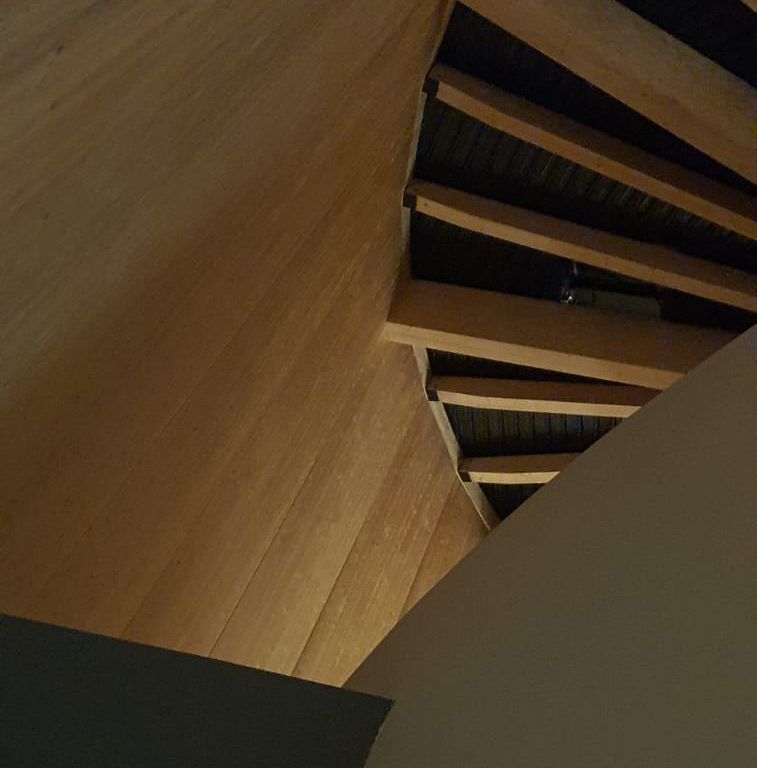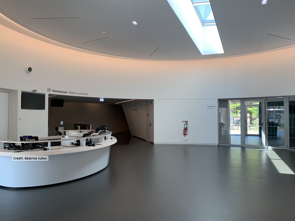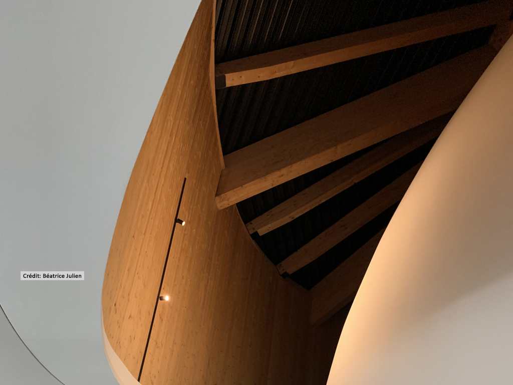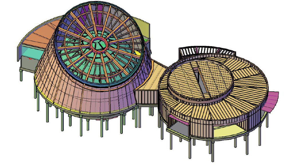 La stabilité du cône est assurée par des panneaux bois type CLT visibles en intérieur. L’écran est suspendu à un dôme hémisphérique en acier.