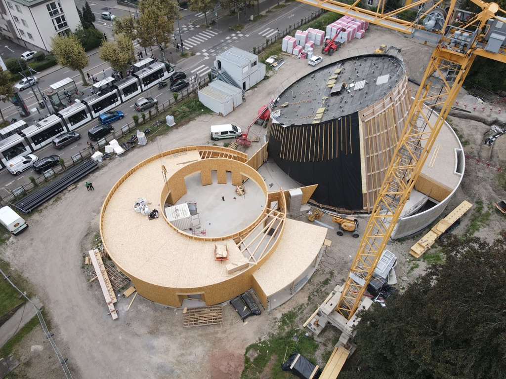 Données techniques : Surface : 980 m², volume bois 280 m3, acier 20 T, béton 540 m3, livraison prévue 2022