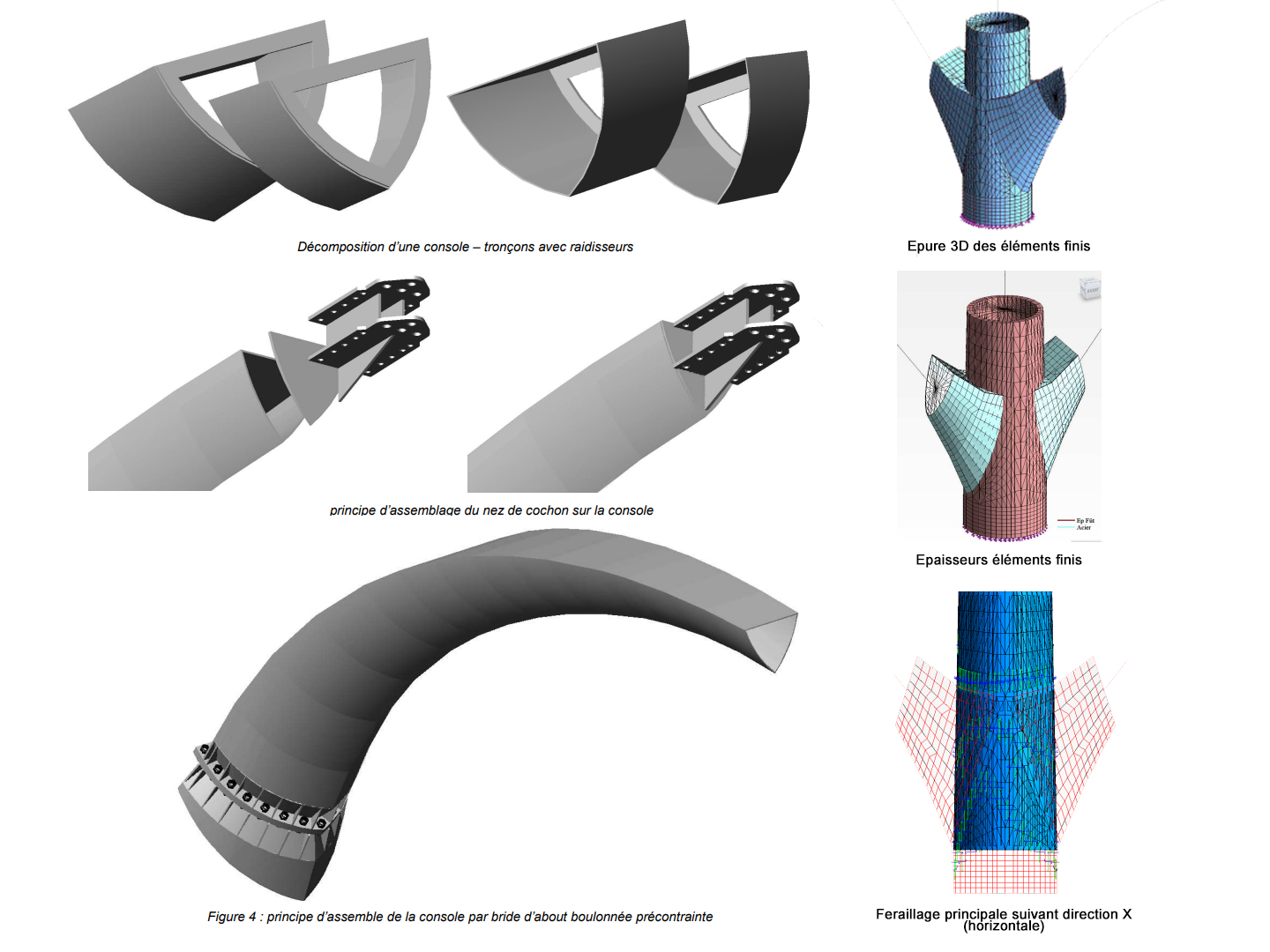 Matériaux : Béton à hautes performances B90 préfabriqué en voussoirs creux, précontrainte par post tension à base de gaines plates, consoles en acier type Corten