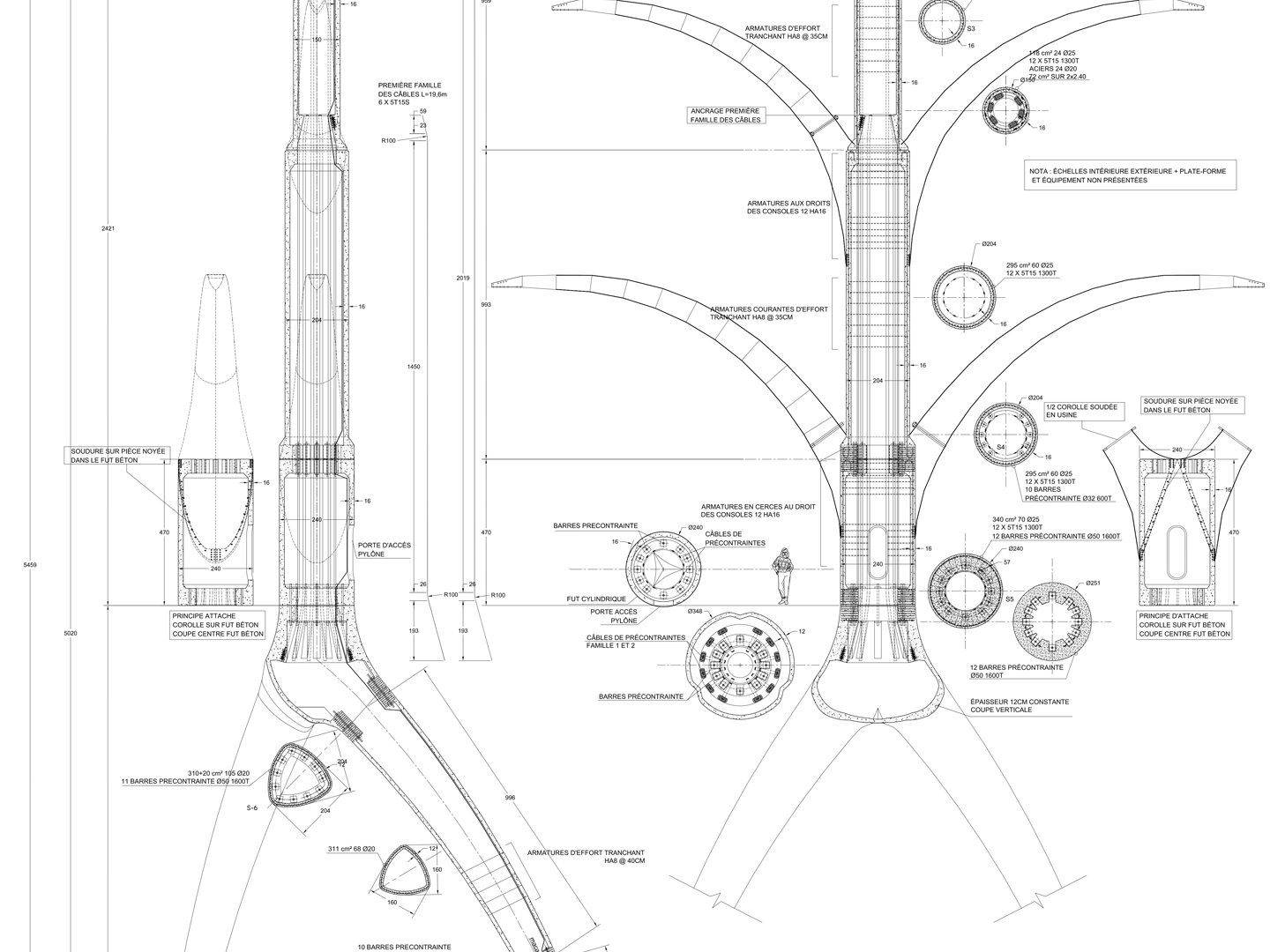 Notre concept est un nouveau type de pylône en béton à très hautes performances de grande hauteur 52 m basé sur un design original composé d'un tripode a arcs courbes et d'un fut vertical conique, fondé sur des fondations spéciales creuses raidies et lestées en béton préfabriqué.