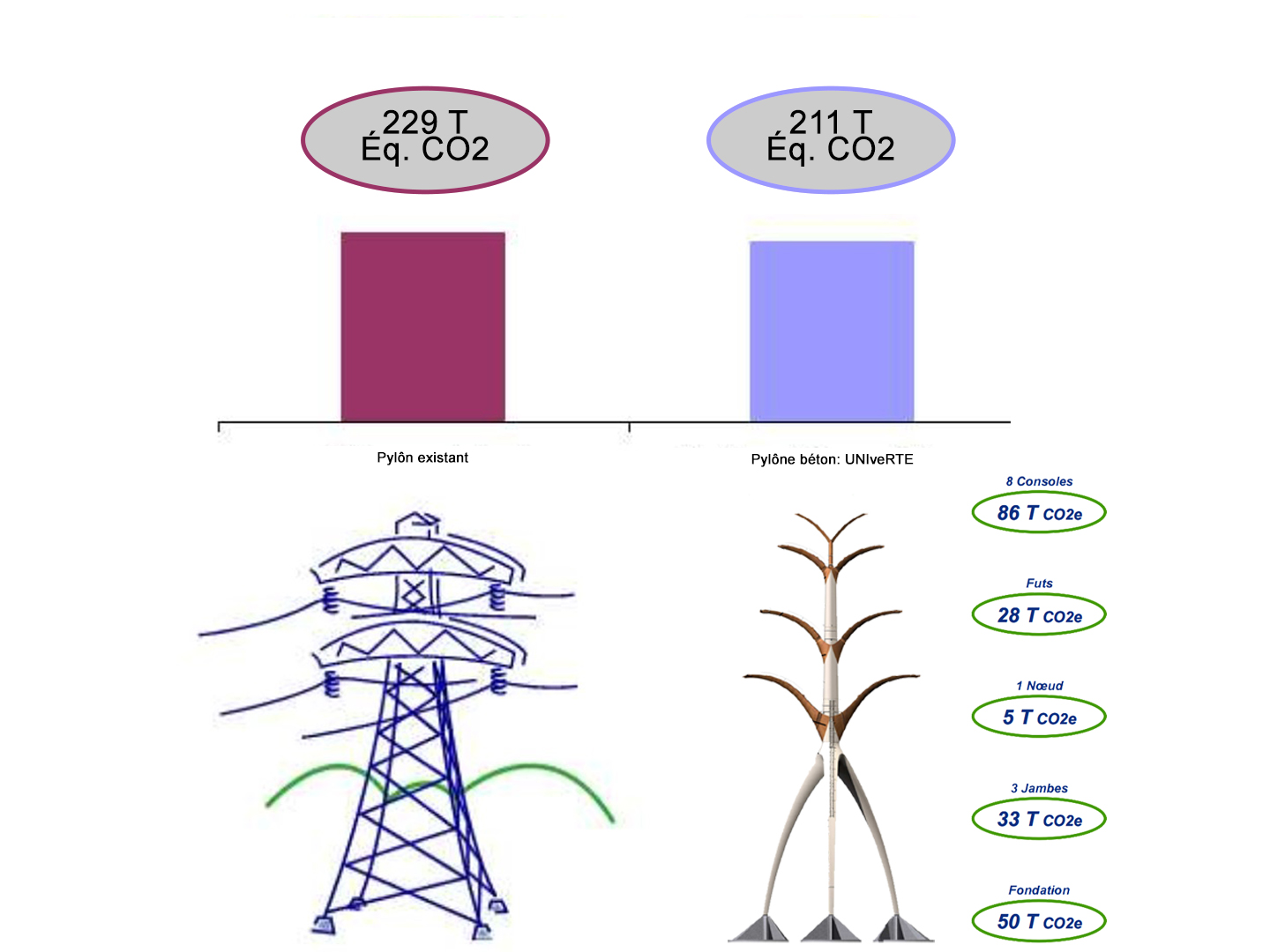 L’impact carbone est faible et proche de l’optimum technique qu’est le pylône treillis métallique standard. Les supports des armements électriques sont conçus en acier de type corten en se basant sur une technique de chaudronnerie avec des sections variables à parois triangulaires cintrées.